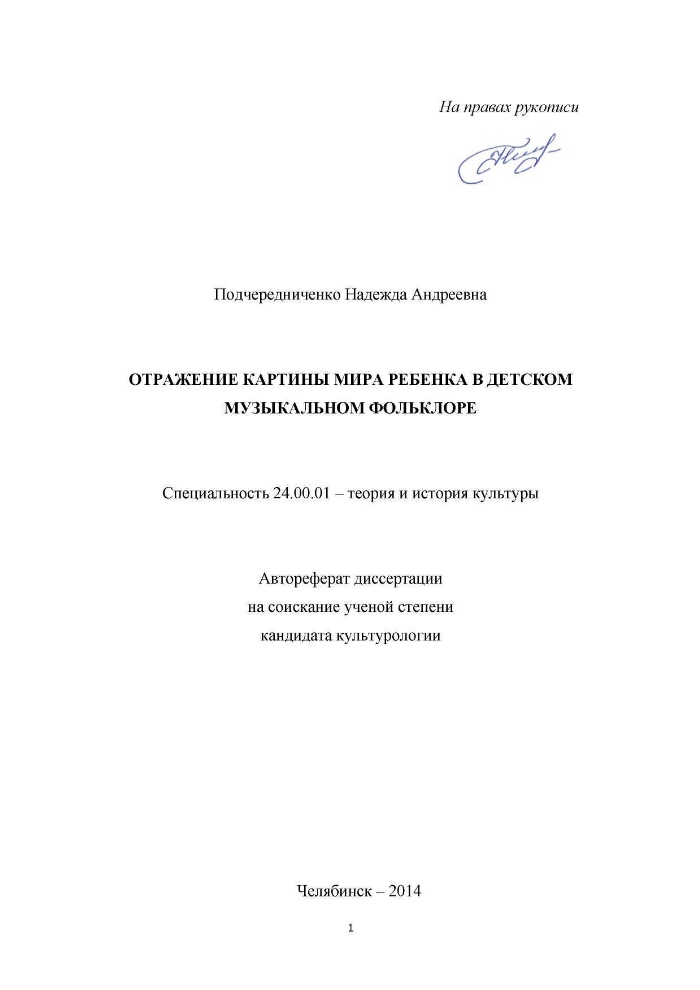 Отражение картины мира ребенка в детском музыкальном фольклоре : автореферат диссертации на соискание ученой степени кандидата культурологии : специальность 24.00.01 / Подчередниченко Надежда Андреевна ; [Челябинская государственная академия культуры и искусств]. - Челябинск, 2014. -22 с. ; 21 см.. - Библиогр.: с. 21-22 (6 назв.).