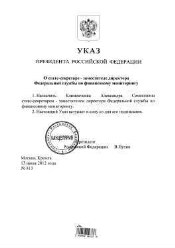 О статс-секретаре - заместителе директора Федеральной службы по финансовому мониторингу : Указ Президента Российской Федерации от 13.06.2012 № 813. - Электронные текстовые данные (1 файл). -(Москва: ГлавНИВЦ УДП РФ , 2018). - Режим доступа: интернет-портал Президентской библиотеки. Загл. с титульной страницы. Электронная версия:Указ Президента Российской Федерации от 13.06.2012 № 813"О статс-секретаре - заместителе директора Федеральной службы по финансовому мониторингу".