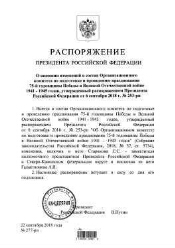 О внесении изменений в состав Организационного комитета по подготовке и проведению празднования 75-й годовщины Победы в Великой Отечественной войне 1941 -1945 годов, утвержденный распоряжением Президента Российской Федерации от 6 сентября 2018 г. № 253-рп : Распоряжение Президента Российской Федерации от 22.09.2018 № 277-рп. - Электронные текстовые данные (1 файл). -(Москва: ГлавНИВЦ УДП РФ , 2018). - Режим доступа: интернет-портал Президентской библиотеки. Загл. с титульной страницы. Электронная версия:Распоряжение Президента Российской Федерации от 22.09.2018 № 277-рп "О внесении изменений в состав Организационного комитета по подготовке и проведению празднования 75-й годовщины Победы в Великой Отечественной войне 1941 -1945 годов, утвержденный распоряжением Президента Российской Федерации от 6 сентября 2018 г. № 253-рп".