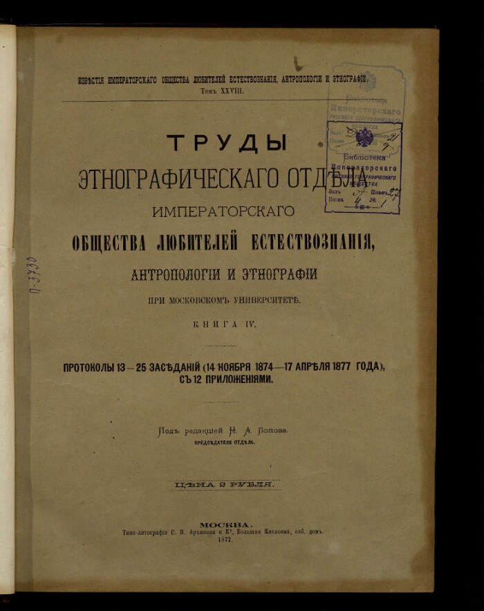 Кн. 4: Протоколы 13-25 заседаний (14 ноября 1874 - 17 апреля 1877 года), с приложениями / под редакцией А. Н. Попова, председателя отдела. - Москва : издание Общества любителей естествознания, антропологии и этнографии, 1877. -[8], 190 с.. - (Известия Императорского общества любителей естествознания, антропологии и этнографии, состоящего при Императорском Московском университете ; т. 18). - Экземпляр РГО со штампом: Библиотека Императорского Русского географического общества.