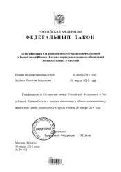 О ратификации Соглашения между Российской Федерацией и Республикой Южная Осетия о порядке пенсионного обеспечения военнослужащих и их семей : Федеральный закон Российской Федерации от 30 марта 2015 года № 59-ФЗ : принят Государственной Думой 20 марта 2015 года : одобрен Советом Федерации 25 марта 2015 года. - Москва, 2015. -1 лист. - Режим доступа: интернет-портал Президентской библиотеки. В конце текста подпись: Президент Российской Федерации В. Путин. Место подписания: Москва. Электронная версия правого акта (1 файл, JPEG : 0,5 МБ). Опубликовано в изданиях: Собрание законодательства Российской Федерации от 2015 г., № 13, ст. 1803 (текст Соглашения - СЗ РФ, 2015, № 30, ст. 4569) ; Официальный интернет-портал правовой информации (www.pravo.gov.ru) от 31.03.2015 г. (№ 0001201503310004).