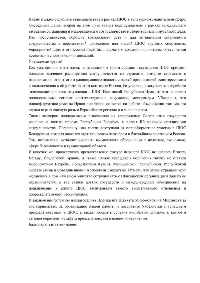 I. Шанхайская организация сотрудничества. Совет глав государств. Заседание. II. Президент России, официальный сайт.1. Путин, Владимир Владимирович (1952) -- Речи, выступления и т.п.. 2. Шанхайская организация сотрудничества -- Деятельность -- Участие Российской Федерации -- Речи, выступления и т.п.. 3. Власть (коллекция). 4. Россия и страны мира (коллекция). 5. Российская Федерация -- Внешняя политика -- нач. 21 в. -- Речи, выступления и т.п.. |
