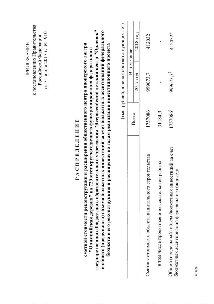 Об осуществлении бюджетных инвестиций в реконструкцию и расширение общественного центра пионерского лагеря "Олимпийская деревня" на 720 мест круглогодичного функционирования федерального государственного бюджетного образовательного учреждения "Всероссийский детский центр "Орленок" : Постановление Правительства Российской Федерации от 31 июля 2017 года № 910. - Москва, 2017. -4 листа. - В конце текста подпись: Председатель Правительства Российской Федерации Д. Медведев. Место подписания: Москва. Электронная версия нормативно-правого акта (4 файла). Содержит также приложение к Постановлению Правительства Российской Федерации от 31 июля 2017 года № 910. - Опубликован в изданиях: Собрание законодательства Российской Федерации от 2017 г., № 32, ст. 5089; Официальный интернет-портал правовой информации (www.pravo.gov.ru) от 3.08.2017 г. (№ 0001201708030034).