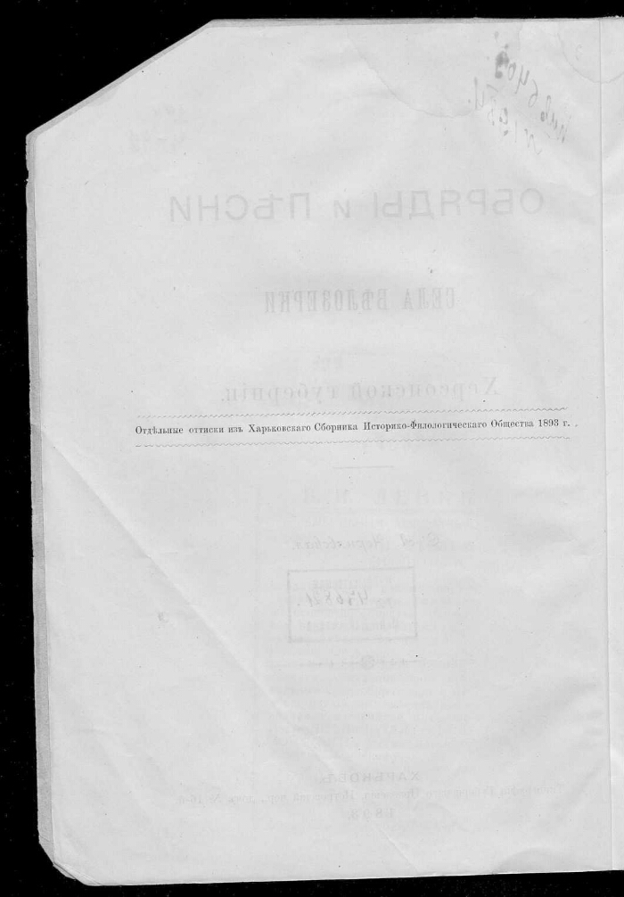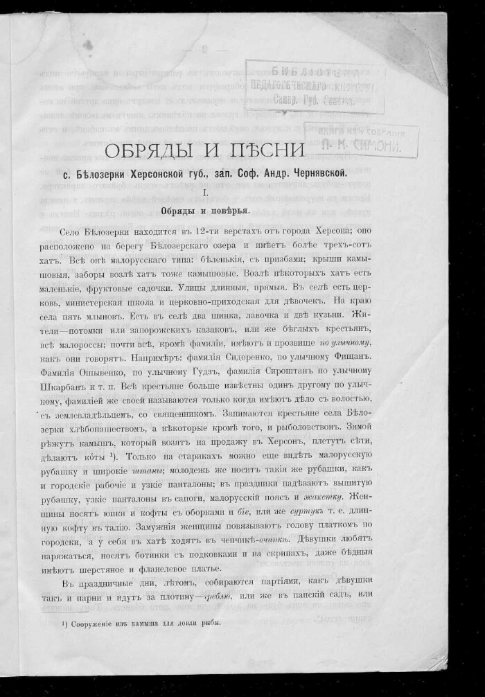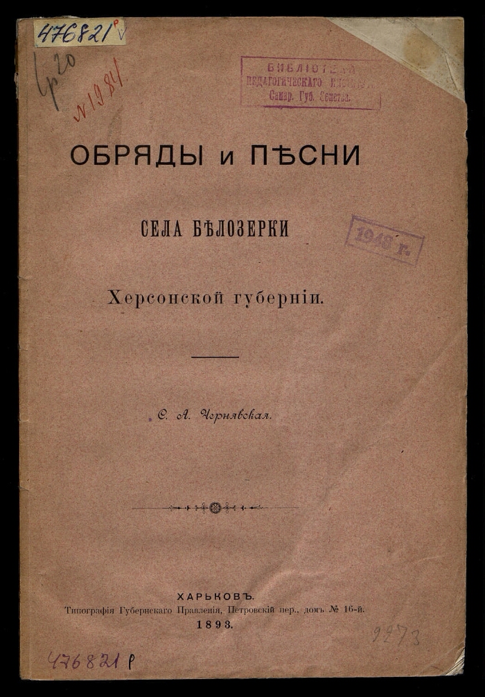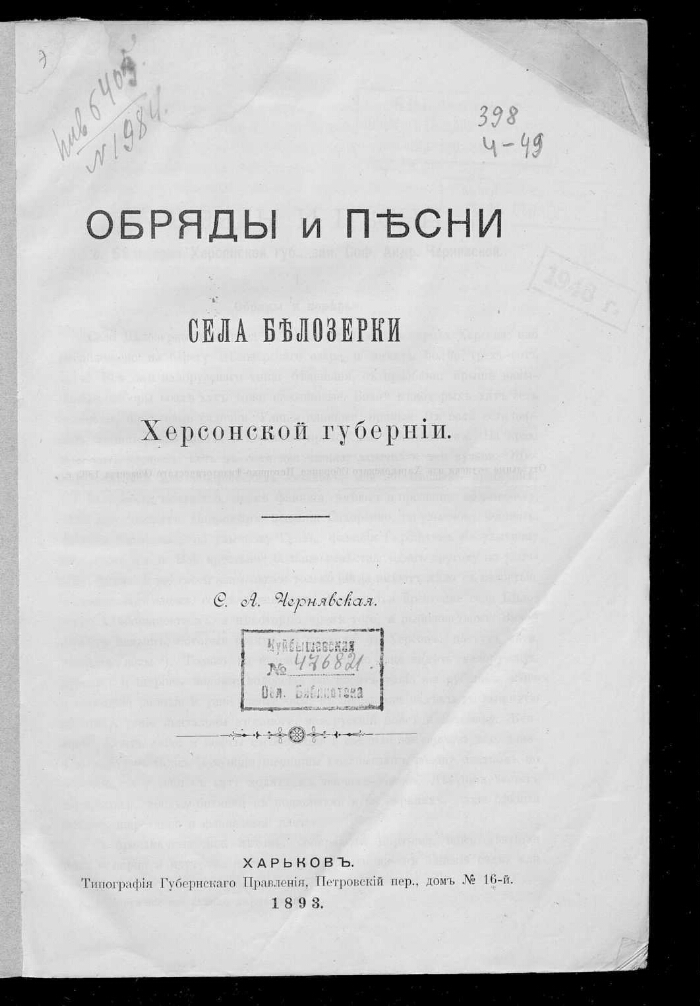 Обряды и песни села Белозерки Херсонской губернии / С. А. Чернявская. - Харьков : Типография губернского правления, 1893. -[2], 85, [1] с.. - Библиография в подстрочных примечаниях. - Отдельные оттиски из Харьковского Сборника историко-филологического общества 1893 г.. - Экземпляр Самарской ОУНБ: из собрания П. К. Симони.