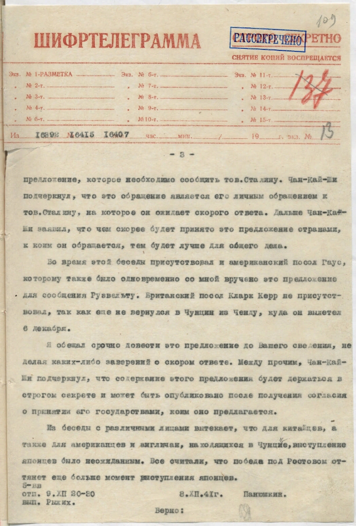 | Заголовок | Шифртелеграмма посла СССР в Китае А. С. Панюшкина И. В. Сталину и в НКИД СССР о беседе с президентом Гоминьдана Чан Кайши по случаю передачи им личного послания И. В. Сталину в связи с нападением Японии на США |
