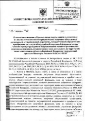 О внесении изменения в Перечень видов спорта, в связи со сложностью и с иными особенностями которых возможны получение общественной организацией, осуществляющей их развитие, государственной аккредитации и приобретение ею статуса общероссийской спортивной федерации, если ее членами и (или) структурными подразделениями являются региональные спортивные федерации, осуществляющие свою деятельность на территориях менее чем половины субъектов Российской Федерации, утвержденный приказом Минспорта России от 09.06.2015 № 597 : Приказ Министерства спорта Российской Федерации от 27.04.2017 № 382. - Электронные текстовые данные (2 файла). -(Москва: ГлавНИВЦ УДП РФ , 2018). - Режим доступа: интернет-портал Президентской библиотеки. Загл. с титульной страницы. Электронная версия:Приказ Министерства спорта Российской Федерации от 27.04.2017 № 382 "О внесении изменения в Перечень видов спорта, в связи со сложностью и с иными особенностями которых возможны получение общественной организацией, осуществляющей их развитие, государственной аккредитации и приобретение ею статуса общероссийской спортивной федерации, если ее членами и (или) структурными подразделениями являются региональные спортивные федерации, осуществляющие свою деятельность на территориях менее чем половины субъектов Российской Федерации, утвержденный приказом Минспорта России от 09.06.2015 № 597".
