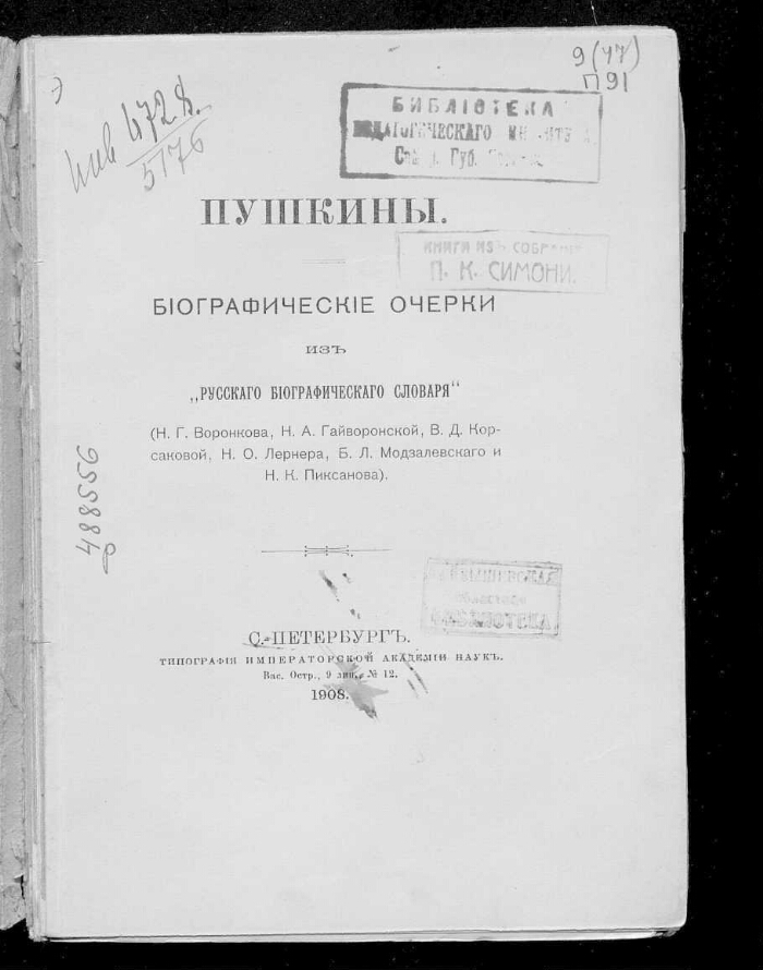 Пушкины : биографические очерки из "Русского биографического словаря" (Н. Г. Воронкова, Н. А. Гайворонской, В. Д. Корсаковой, Н. О. Лернера, Б. Л. Модзалевского и Н. К. Пиксанова). - С.-Петербург : типография Императорской Академии наук, 1908. -[2], 137 с.. - Библиография в подстрочных примечаниях и в тексте. - Экземпляр Самарской ОУНБ со штампом: Книги из собрания П. К. Симони.