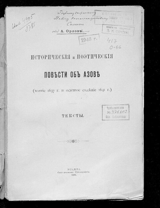 Исторические и поэтические повести об Азове : (взятие 1637 г. и осадное сидение 1641 г.) : тексты / А. Орлов. - Москва : Синодальная типография, 1906. -[6], V, 236 с.. - Библиография в тексте и в подстрочных примечаниях. - Экземпляр Самарской ОУНБ с рукописными пометами, с дарственной надписью П. К. Симони и штампом: Книги из библиотеки П. К. Симони.
