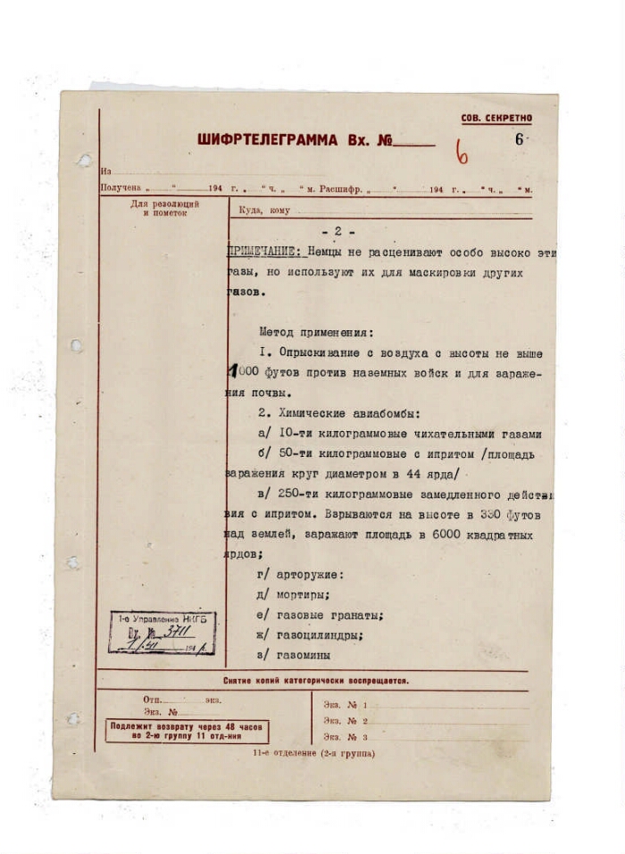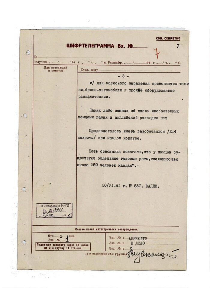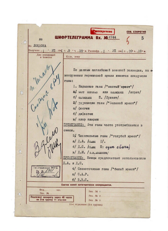 | Заголовок | Агентурное сообщение (шифртелеграмма) из Лондона о наличии на вооружении германской армии химического оружия |
