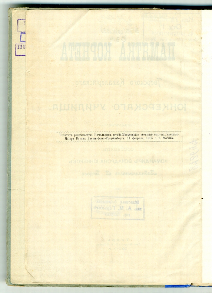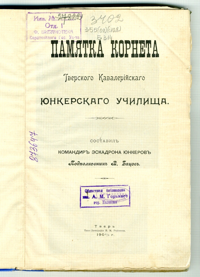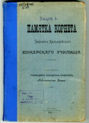 Памятка корнета Тверского кавалерийского юнкерского училища / составил командир эскадрона юнкеров подполковник В. Бацов. - Тверь : типо-литография Н. М. Родионова, 1904/5. -[6], VII, 282, 23 с., [1] л. ил., VI л. ил. : ил.. - .