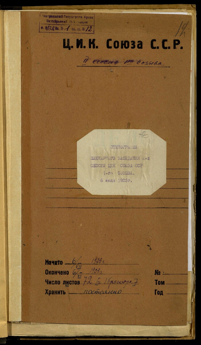 Идентификатор eb174f61-c10b-477a-a9fe-fa4831987ce8 Заголовок Стенограмма Пленарного Заседания 2-й Сессии ЦИК СССР 1-го созыва Даты 1923 Примечания Часть текста рукописная и машинописная, часть - напечатана типографским способом Язык текста Русский Уровень Дело Шифр хранения ГА РФ. 3316 / 1 / 12 Организация-создатель записи GA_RF Описи Дела 1-го Съезда Советов и 1-й, 2-й, 3-й сессий ЦИК СССР 1-го созыва Объем 97 листов Автор СССР. Центральный исполнительный комитет Фонд ЦЕНТРАЛЬНЫЙ ИСПОЛНИТЕЛЬНЫЙ КОМИТЕТ СССР (ЦИК СССР) Аннотация Входит в раздел описи: 1-й Съезд Советов. 2-я Сессия ЦИК СССР Формат отображения Архивное описание RUSMARC В коллекциях Президентская библиотека – учителям: обучение с использованием первоисточников → Единый учебник истории → Коллекции Президентской библиотеки, вошедшие в единый учебник истории для старшеклассников → Образование Союза Советских Социалистических Республик → Формирование общесоюзных органов власти Государика → Конституция России → Конституция – Основной закон → Конституция (основной закон) СССР 1924 г. и конституции (основные законы) республик СССР 1920-х гг. → Принятие Конституции (основного закона) СССР 1924 г. и конституций (основных законов) республик СССР 1920-х гг. → Принятие Конституции (основного закона) СССР 1924 г.