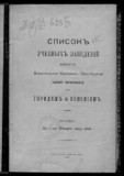 Список учебных заведений ведомства Министерства народного просвещения (кроме начальных) по городам и селениям. - Санкт-Петербург, 1883-1916. - 24-28. - Загл. списков за 1883-84, 1890-91 учеб. г.: Списки учебных заведений...; за 1895, 1905 гг.: Учебные заведения... Изд-во 1895, 1905 гг.: Деп. нар. просвещения.