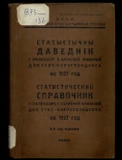 Статистический справочник и календарь с записной книжкой для стат.-корреспондента на 1927 год = Статыстычны даведнік і каляндар з запісной кніжкай для стат.-карэспандэнта на 1927 год : Год изд. 6 / БССР. Центр. стат. управа. - Минск : Тип. "Полепечать", 1927. -VIII, 377, 401-524, IV с., 1 л. схем. : табл.. - Тит. л. и обл. парал. на рус. и белорус. яз. Экз. деф.: после с. 377 идет с. 401.