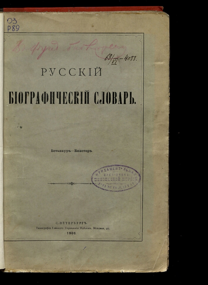 Русский биографический словарь : [т. 1-25] / издан под наблюдением председателя Императорского Русского исторического общества А. А. Половцова. - Санкт-Петербург : Императорское Русское историческое общество, 1896-1918. -25 т. ; 29 см. - Редакторы: т. 4-5 - Н. П. Чулков; т. 7 - Е. С. Шумигорский и М. Г. Курдюмов; т. 10 - Н. Д. Чечулин и М. Г. Курдюмов; т. 17 - Б. Л. Модзалевский. Место издания т. 4-5: Москва.