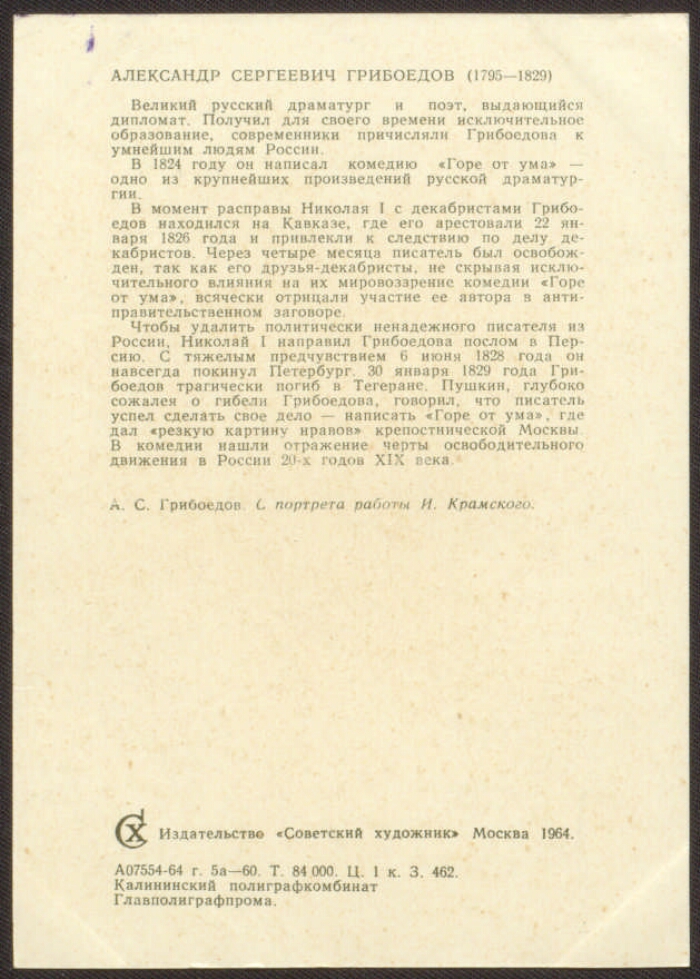 А. С. Грибоедов. С портрета работы И. Крамского : [открытка] / [аннотация И. Гладыш]. - Электронные данные (2 файла). -(Санкт-Петербург: Президентская библиотека , 2021). - Режим доступа: интернет-портал Президентской библиотеки. Заглавие с экрана. На оборотной стороне текст - краткие сведения о писателе. Открытка является частью комплекта: Русские писатели / аннотации И. Гладыш. Москва : Советский художник, 1964. 15 открыток в обложке. 15 коп. Автор текста установлен по комплекту. Электронная репродукция открытки: А. С. Грибоедов. С портрета работы И. Крамского / [аннотация И. Гладыш]. Москва : Советский художник, 1964. 1 открытка : офсет. А 07554-64 г. 1 коп. Тираж 84000 экз. Местонахождение: Детский музей открытки, Санкт-Петербург. Копирование пользователями не разрешается.
