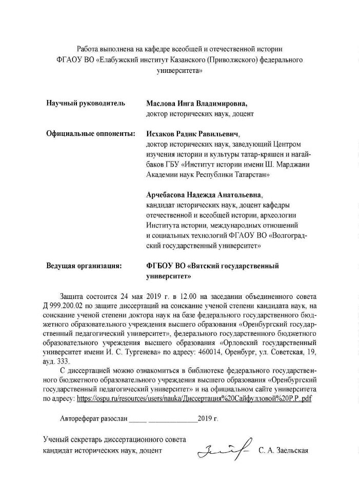 Социально-профессиональный статус учительства российской провинции во второй половине XIX - начале XX в. (на материалах Казанской и Вятской губерний) : автореферат диссертации на соискание ученой степени кандидата исторических наук : специальность 07.00.02 / Сайфуллова Разиля Рауиловна ; [Елабужский институт Казанского (Приволжского) федерального университета ; Место защиты: Оренбургский государственный педагогический университет]. - Оренбург, 2019. -30 с. ; 21 см. - Место защиты: Оренбургский государственный педагогический университет. - Библиография: с. 28-30 (15 названий) и в подстрочных примечаниях.