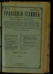 Уральский техник : Ежемес. журн. : Орган Уральского межсекц. бюро инженеров и техников Уралпрофсовета. - Свердловск, 1907-1932. - Места издания: 1907-1924 № 1 Екатеринбург 1924 № 2 - 1932 Свердловск. Издательства: 1907-1911 № 4/5 В.М. Быков1911 № 6/7 - 1912 № 3 С.И. Литвинов 1912 № 4/5 - 1916 Т.Ф. Протасов 1917-1918 Союз. проф. тех. организаций Урала 1928 № 7 - 1939 ОМБИТ. Надзаг.: 1924-1928 Урал. обл. межсекционное бюро инж.-техн. сил при Урал. проф. совете. В 1908-1918 гг. журн. выходил в двух отделах: Отдел профессиональных и Отдел технический. Подзаг.: 1907-1918 Ежемес. техн. и проф. журн.1924-1928 Ежемес. журн.192?-1932 ... Орган Урал. межсекционного бюро инженеров и техников Уралпрофсовета.