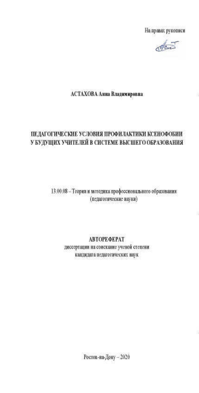Педагогические условия профилактики ксенофобии у будущих учителей в системе высшего образования : автореферат диссертации на соискание ученой степени кандидата педагогических наук : специальность 13.00.08 / Астахова Анна Владимировна ; [Донской государственный технический университет ; Место защиты: Южный федеральный университет]. - Ростов-на-Дону, 2020. -21 с. : ил. ; 21 см. - Место защиты: Южный федеральный университет. - Библиография: с. 19-20 (12 названий).
