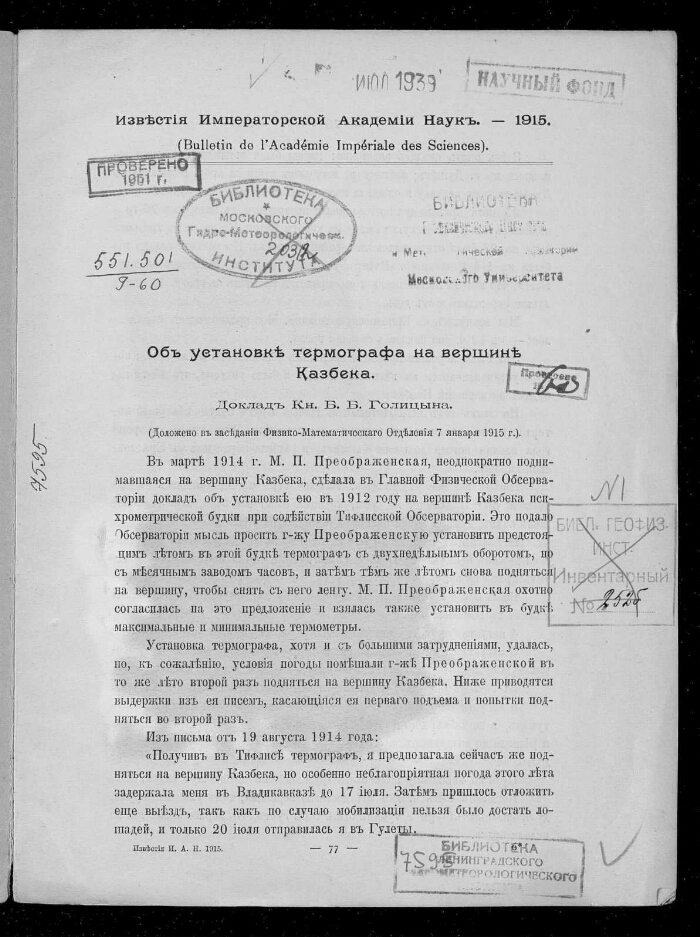 Об установке термографа на вершине Казбека : (доложено в заседании Физико-Математического Отделения 7 января 1915 г.) / доклад Князя Б. Б. Голицына. - Петроград : типография Императорской Академии наук, 1915. -С. 77-82 : ил.. - [Оттиск из] "Известий Императорской Академии наук" за 1915 г.. - Экземпляр без титульного листа.