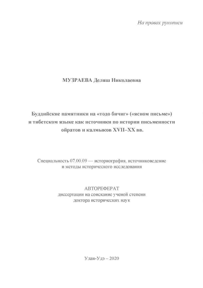 Буддийские памятники на "тодо бичиг" ("ясном письме") и тибетском языке как источники по истории письменности ойратов и калмыков XVII-XX вв. : автореферат диссертации на соискание ученой степени доктора исторических наук : специальность 07.00.09 / Музраева Деляш Николаевна ; [Ин-т монголоведения, буддологии и тибетологии Сиб. отдел. РАН]. - Улан-Удэ, 2020. -38 с. ; 21 см.. - Библиогр.: с. 32-38 (69 назв.).