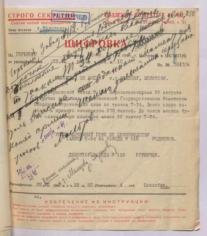 | Примечания | Подлинник. Резолюция В. М. Молотова: "Горький, завод № 112. Рубинчику. Копия Родионову. Досрочное выполнение августовского плана по танкам Т-34 хорошее дело, столь важное в данный момент для нашей армии. Желаю дальнейших серьезных успехов. Молотов" |