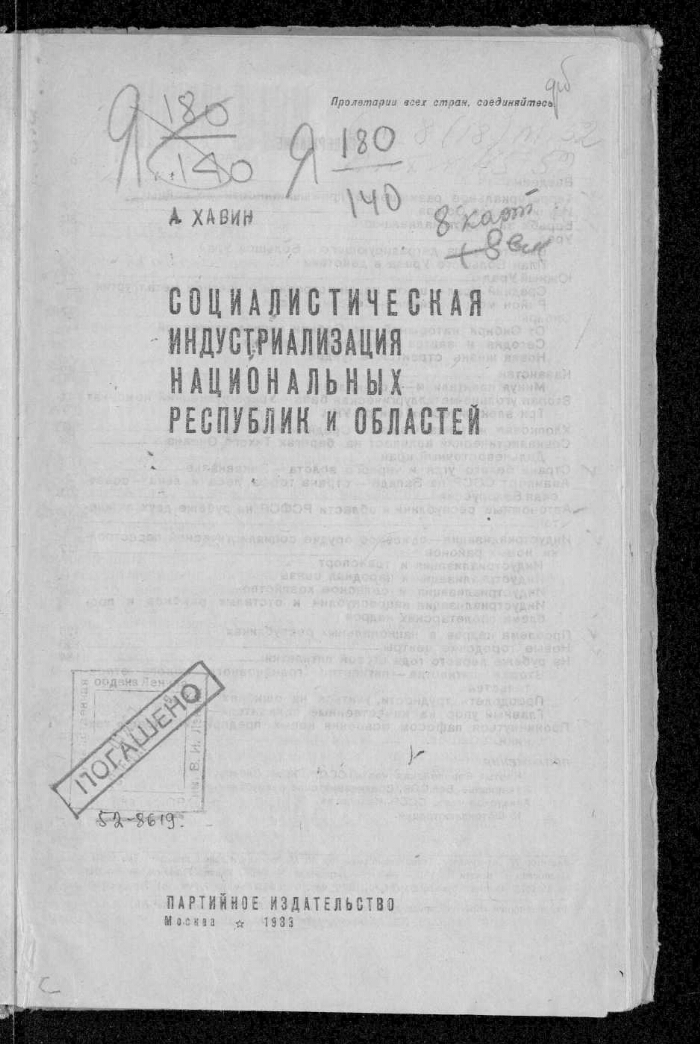 Социалистическая индустриализация национальных республик и областей / А. Хавин ; [введение: И. Хансуваров]. - Москва : Партийное издательство, 1933. -148 с., 16 л. ил., карт. : табл. ; 23 см. - Библиография в подстрочных примечаниях. - Экземпляр РГБ: с рукописными пометами.