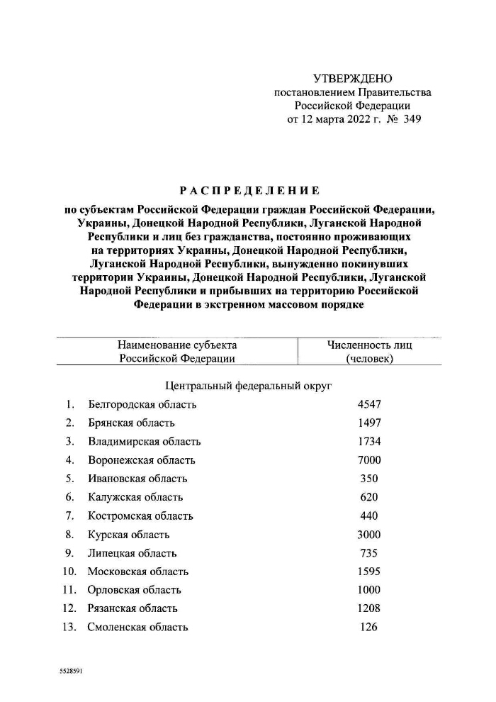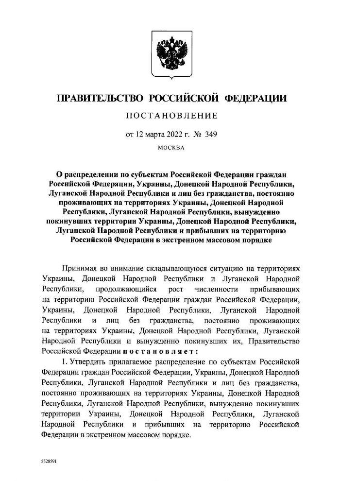 О распределении по субъектам Российской Федерации граждан Российской Федерации, Украины, Донецкой Народной Республики, Луганской Народной Республики и лиц без гражданства, постоянно проживающих на территориях Украины, Донецкой Народной Республики, Луганской Народной Республики, вынужденно покинувших территории Украины, Донецкой Народной Республики, Луганской Народной Республики и прибывших на территорию Российской Федерации в экстренном массовом порядке : Постановление Правительства Российской Федерации от 12 марта 2022 года № 349. - Москва, 2022. -2, 4 листа. - В конце текста подпись: Председатель Правительства Российской Федерации М. Мишустин. Место подписания: Москва. Электронная версия правового акта (6 файлов, JPEG : 3,1 МБ). Содержит: Распределение по субъектам Российской Федерации граждан Российской Федерации, Украины, Донецкой Народной Республики, Луганской Народной Республики и лиц без гражданства, постоянно проживающих на территориях Украины, Донецкой Народной Республики, Луганской Народной Республики, вынужденно покинувших территории Украины, Донецкой Народной Республики, Луганской Народной Республики и прибывших на территорию Российской Федерации в экстренном массовом порядке : утверждено Постановлением Правительства Российской Федерации от 12 марта 2022 года № 349. - Опубликовано в изданиях: Официальный интернет-портал правовой информации (www.pravo.gov.ru) от 12.3.2022 г. , (ст. 0001202203120005); "Российская газета" от 16.3.2022 г.; Собрание законодательства Российской Федерации от 2022 г. , N 12 , ст. 1835.