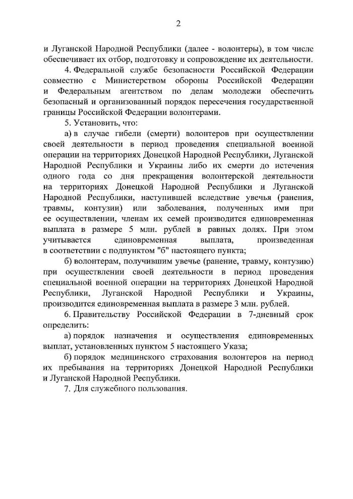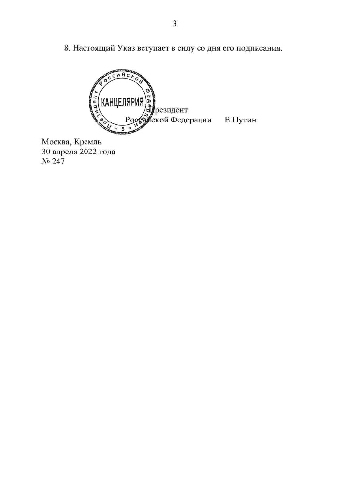 О поддержке волонтерской деятельности на территориях Донецкой Народной Республики и Луганской Народной Республики : Указ Президента Российской Федерации от 30 апреля 2022 года № 247. - Москва, 2022. -3 листа. - Режим доступа: интернет-портал Президентской библиотеки. В конце текста подпись: Президент Российской Федерации В. Путин. Место и дата подписания: Москва, Кремль, 30 апреля 2022 года, № 247. Электронная версия правого акта (3 файла, JPEG : 1,5 МБ). Опубликовано в издании: Официальный интернет-портал правовой информации (www.pravo.gov.ru) от 30.4.2022 г. , (ст. 0001202204300017); Собрание законодательства Российской Федерации от 2022 г. , N 18 , ст. 3056.