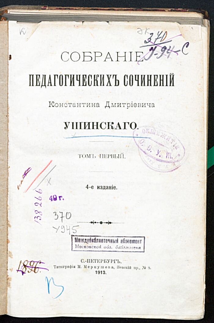 Собрание педагогических сочинений Константина Дмитриевича Ушинского. - 4-е издание. -С.-Петербург : Типография М. Меркушева, 1913. - 22 см. -