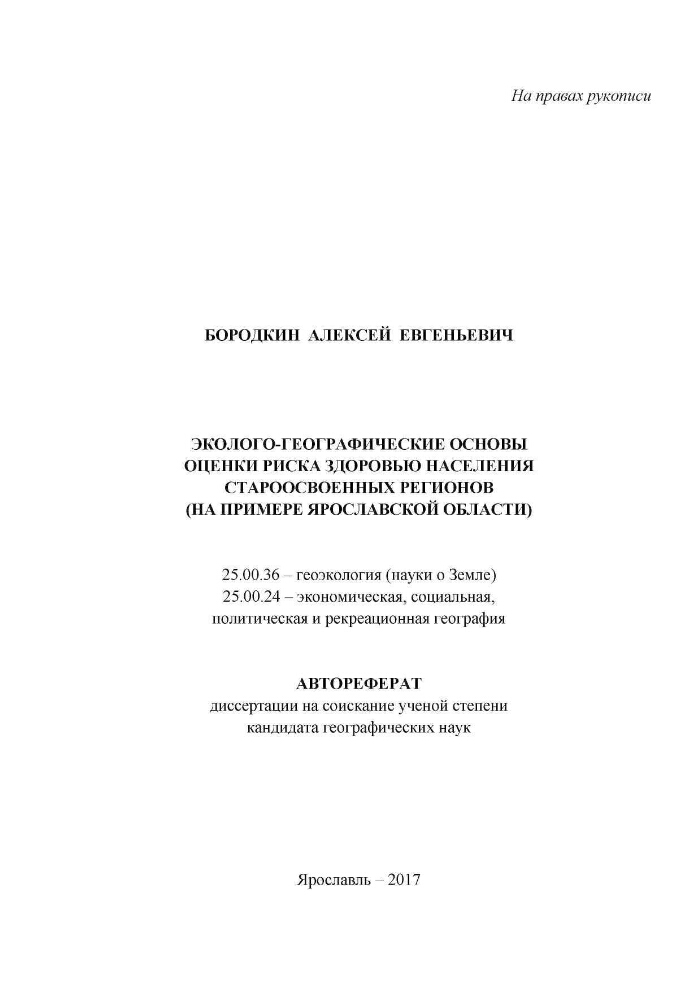 Эколого-географические основы оценки риска здоровью населения староосвоенных регионов (на примере Ярославской области) : автореферат диссертации на соискание ученой степени кандидата географических наук : специальность 25.00.36 : специальность 25.00.24 / Бородкин Алексей Евгеньевич ; [Место защиты: Ин-т географии РАН]. - Ярославль, 2017. -32 с. : ил. ; 21. - Библиогр.: с. 30-32 (23 назв.).