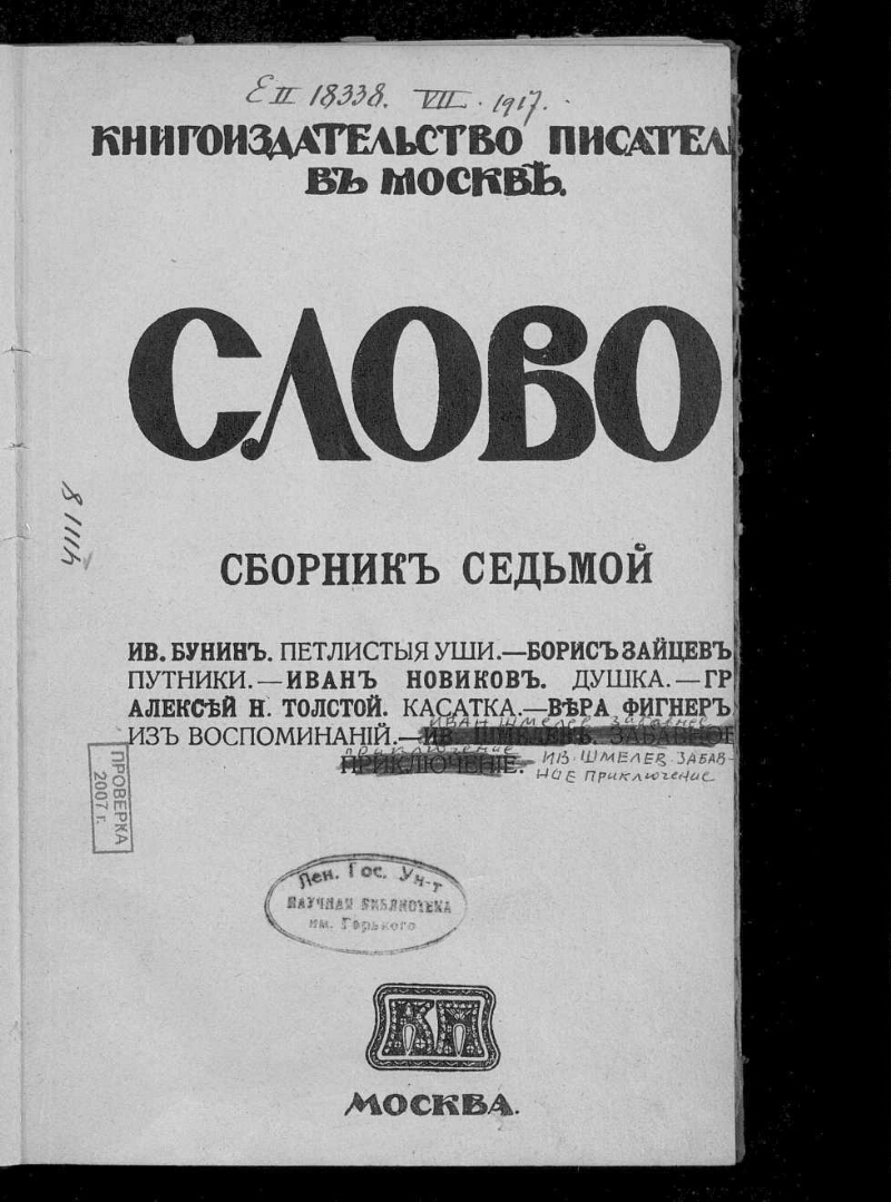 Сб. 7. - Товарищество скоропечатни А. А. Левинсона, [1917]. -[2], 231 с.. - Часть текста на итальянском языке. Содержит: Петлистые уши / И. Бунин (с. 217–231 (сканы 187–201)). Путник / Б. Зайцев. Душка / И. Новиков. Касатка / А. Н. Толстой. Из воспоминаний В. Фигнер. Забавное приключение / И. Шмелев. - Библиография в тексте и подстрочных примечаниях. - Экземпляр без обложки.