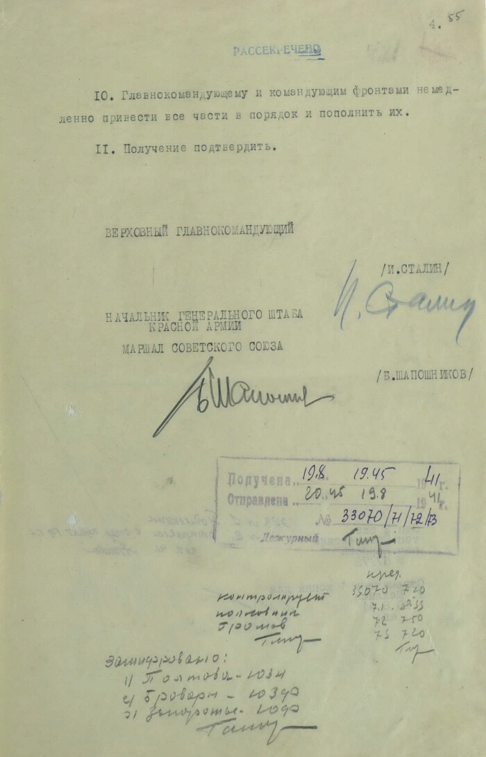 Примечания | Подлинник. Подписи - автографы И. В. Сталина и Б. М. Шапошникова |
