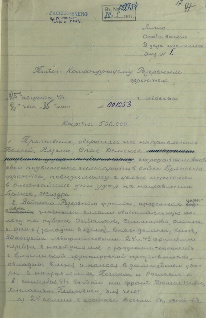 | Заголовок | Директива Ставки Верховного Главнокомандования № 001253 командующему войсками Резервного фронта о подготовке операции по разгрому ельнинской группировки противника |