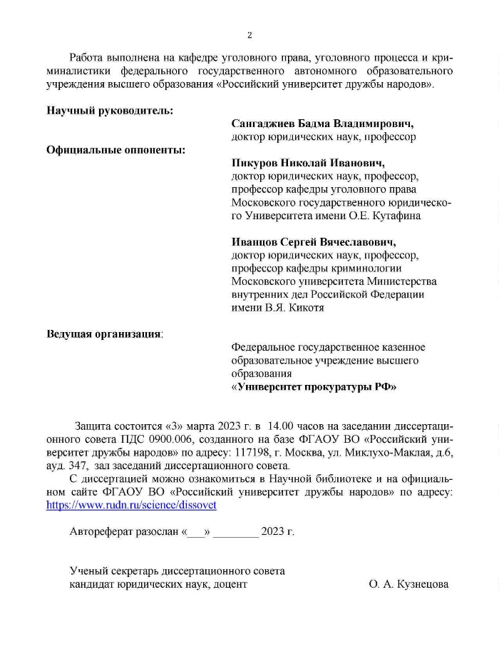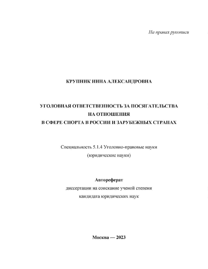 Уголовная ответственность за посягательства на отношения в сфере спорта в России и зарубежных странах : автореферат диссертации на соискание ученой степени к. ю. н. : специальность 5.1.4. Уголовно-правовые науки / Крупник Инна Александровна ; [РУДН]. - Москва, 2022. -26 с. ; 21. - Библиогр.: с. 25 (3 назв.).