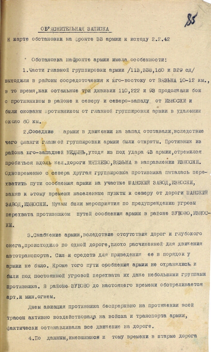 | Заголовок | Объяснительная записка к карте обстановки на фронте 33-й армии к исходу 2 февраля 1942 г. |