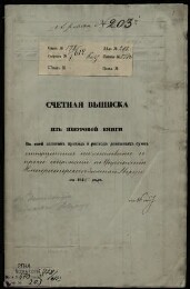 | Заголовок | Счетная выписка майора от ворот, подполковника Кубе из шнуровой книги, в которой записан приход и расход денежных сумм, отпущенных на жалованье и прочее содержание, по управлению Императорского Зимнему дворцу за 1846 год |