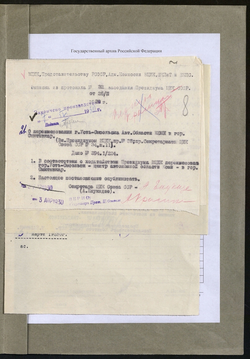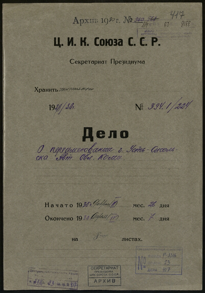 | Примечания | Заголовок дела на папке: О переименовании г. Усть-Сысольска Автономной Области Коми Обратная нумерация листов Часть текста машинописная и рукописная, часть - напечатана типографским способом |