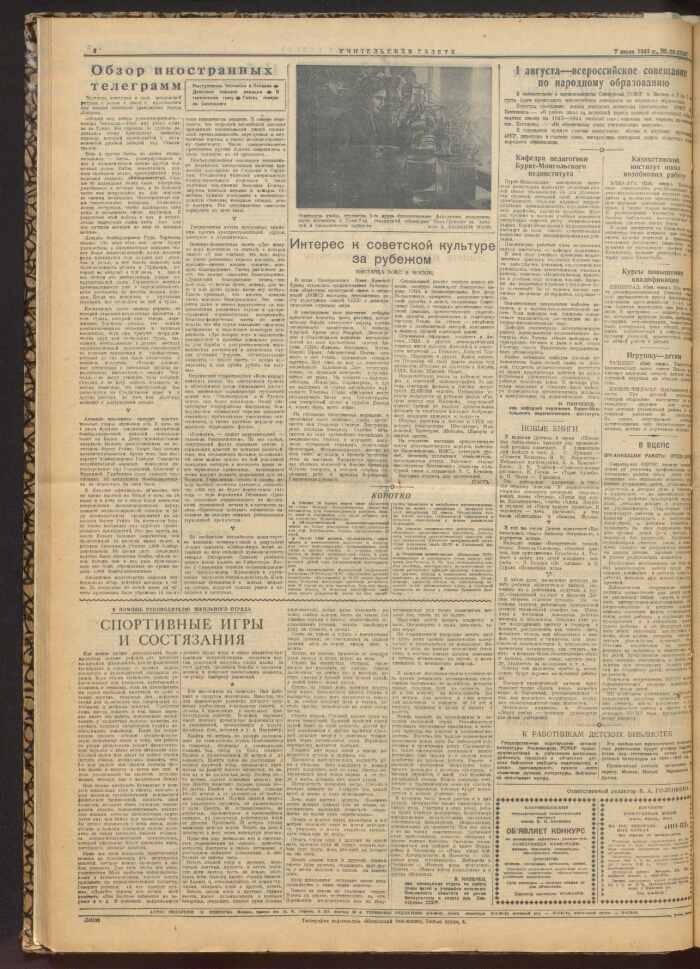Учительская газета : орган Министерства просвещения СССР и Центрального комитета Профсоюза работников просвещения, высшей школы и научных учреждений. - 1924, № 1 (3 октября) -. -Москва, 1924-. - Заглавие: 1930, № 42 - 1936 "За коммунистическое просвещение", с октября 1937 вновь выходит под названием "Учительская газета". Подзаголовок: 1920-е гг. орган Центрального комитета Союза работников просвещения СССР ; 1930-е - 1940-е гг. орган министерств просвещения союзных республик и центральных комитетов профсоюзов работников начальной и средней школы, высшей школы и научно-исследовательских учреждений, политико-просветительных учреждений и дошкольных работников ; 1950-е гг. орган министерств просвещения союзных республик и центральных комитетов профсоюзов работников начальной и средней школы, высшей школы и научных учреждений, политико-просветительных учреждений ; орган министерств просвещения союзных республик и центральных комитетов профсоюзов работников просвещения ; 1960-е гг. орган Министерства просвещения РСФСР и Центрального комитета Профсоюза работников просвещения, высшей школы и научных учреждений СССР ; 1970-е - 1980-е гг. орган Министерства просвещения СССР и Центрального комитета Профсоюза работников просвещения, высшей школы и научных учреждений ; 2000-е гг. независимое педагогические издание. С 2010 г. с тематическими приложениями-вкладками к отдельным выпускам. В 1924-1991 гг. выходила 3 раза в неделю, с 1992 г. - 1 раз в неделю. - Выходит с 3 октября 1924 г. Основана в 1924 г. при участии Н. К. Крупской. Первый номер вышел 3 октября 1924 г. Издавалась в Москве как орган Министерства просвещения СССР и Центрального комитета Профсоюза работников просвещения, высшей школы и научных учреждений. С 1930 (№ 42) по 1936 гг. называлась "За коммунистическое просвещение", с октября 1937 г. вновь выходит под прежним названием. Периодичность: 3 раза в неделю. Кроме центральной газеты в союзных республиках также издавались газеты на национальных языках. В 1991 г. газета стала независимым изданием. Учредитель: Журналистский коллектив редакции. Издатель: АО "Издательский дом "Учительская газета". Периодичность: 1 раз в неделю (с 1992 г.). На страницах "Учительской газеты" освещаются различные проблемы воспитания и обучения, педагогического образования, жизни и труда учителей, размещаются материалы о передовом опыте учителей. -ISSN 0233-4488
