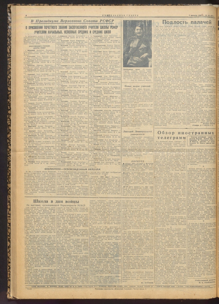 Учительская газета : орган Министерства просвещения СССР и Центрального комитета Профсоюза работников просвещения, высшей школы и научных учреждений. - 1924, № 1 (3 октября) -. -Москва, 1924-. - Заглавие: 1930, № 42 - 1936 "За коммунистическое просвещение", с октября 1937 вновь выходит под названием "Учительская газета". Подзаголовок: 1920-е гг. орган Центрального комитета Союза работников просвещения СССР ; 1930-е - 1940-е гг. орган министерств просвещения союзных республик и центральных комитетов профсоюзов работников начальной и средней школы, высшей школы и научно-исследовательских учреждений, политико-просветительных учреждений и дошкольных работников ; 1950-е гг. орган министерств просвещения союзных республик и центральных комитетов профсоюзов работников начальной и средней школы, высшей школы и научных учреждений, политико-просветительных учреждений ; орган министерств просвещения союзных республик и центральных комитетов профсоюзов работников просвещения ; 1960-е гг. орган Министерства просвещения РСФСР и Центрального комитета Профсоюза работников просвещения, высшей школы и научных учреждений СССР ; 1970-е - 1980-е гг. орган Министерства просвещения СССР и Центрального комитета Профсоюза работников просвещения, высшей школы и научных учреждений ; 2000-е гг. независимое педагогические издание. С 2010 г. с тематическими приложениями-вкладками к отдельным выпускам. В 1924-1991 гг. выходила 3 раза в неделю, с 1992 г. - 1 раз в неделю. - Выходит с 3 октября 1924 г. Основана в 1924 г. при участии Н. К. Крупской. Первый номер вышел 3 октября 1924 г. Издавалась в Москве как орган Министерства просвещения СССР и Центрального комитета Профсоюза работников просвещения, высшей школы и научных учреждений. С 1930 (№ 42) по 1936 гг. называлась "За коммунистическое просвещение", с октября 1937 г. вновь выходит под прежним названием. Периодичность: 3 раза в неделю. Кроме центральной газеты в союзных республиках также издавались газеты на национальных языках. В 1991 г. газета стала независимым изданием. Учредитель: Журналистский коллектив редакции. Издатель: АО "Издательский дом "Учительская газета". Периодичность: 1 раз в неделю (с 1992 г.). На страницах "Учительской газеты" освещаются различные проблемы воспитания и обучения, педагогического образования, жизни и труда учителей, размещаются материалы о передовом опыте учителей. -ISSN 0233-4488