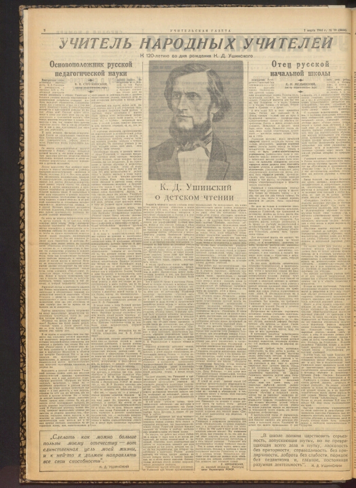 Учительская газета : орган Министерства просвещения СССР и Центрального комитета Профсоюза работников просвещения, высшей школы и научных учреждений. - 1924, № 1 (3 октября) -. -Москва, 1924-. - Заглавие: 1930, № 42 - 1936 "За коммунистическое просвещение", с октября 1937 вновь выходит под названием "Учительская газета". Подзаголовок: 1920-е гг. орган Центрального комитета Союза работников просвещения СССР ; 1930-е - 1940-е гг. орган министерств просвещения союзных республик и центральных комитетов профсоюзов работников начальной и средней школы, высшей школы и научно-исследовательских учреждений, политико-просветительных учреждений и дошкольных работников ; 1950-е гг. орган министерств просвещения союзных республик и центральных комитетов профсоюзов работников начальной и средней школы, высшей школы и научных учреждений, политико-просветительных учреждений ; орган министерств просвещения союзных республик и центральных комитетов профсоюзов работников просвещения ; 1960-е гг. орган Министерства просвещения РСФСР и Центрального комитета Профсоюза работников просвещения, высшей школы и научных учреждений СССР ; 1970-е - 1980-е гг. орган Министерства просвещения СССР и Центрального комитета Профсоюза работников просвещения, высшей школы и научных учреждений ; 2000-е гг. независимое педагогические издание. С 2010 г. с тематическими приложениями-вкладками к отдельным выпускам. В 1924-1991 гг. выходила 3 раза в неделю, с 1992 г. - 1 раз в неделю. - Выходит с 3 октября 1924 г. Основана в 1924 г. при участии Н. К. Крупской. Первый номер вышел 3 октября 1924 г. Издавалась в Москве как орган Министерства просвещения СССР и Центрального комитета Профсоюза работников просвещения, высшей школы и научных учреждений. С 1930 (№ 42) по 1936 гг. называлась "За коммунистическое просвещение", с октября 1937 г. вновь выходит под прежним названием. Периодичность: 3 раза в неделю. Кроме центральной газеты в союзных республиках также издавались газеты на национальных языках. В 1991 г. газета стала независимым изданием. Учредитель: Журналистский коллектив редакции. Издатель: АО "Издательский дом "Учительская газета". Периодичность: 1 раз в неделю (с 1992 г.). На страницах "Учительской газеты" освещаются различные проблемы воспитания и обучения, педагогического образования, жизни и труда учителей, размещаются материалы о передовом опыте учителей. -ISSN 0233-4488