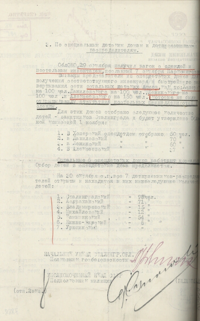 | Заголовок | Письмо начальника Управления НКВД Сталинградской области В. С. Прошина заместителю наркома внутренних дел СССР В. В. Чернышову о ходе исполнения постановления СНК СССР и ЦК ВКП(б) от 21 августа 1943 г. по организации специальных детских учреждений в Сталинградской области |