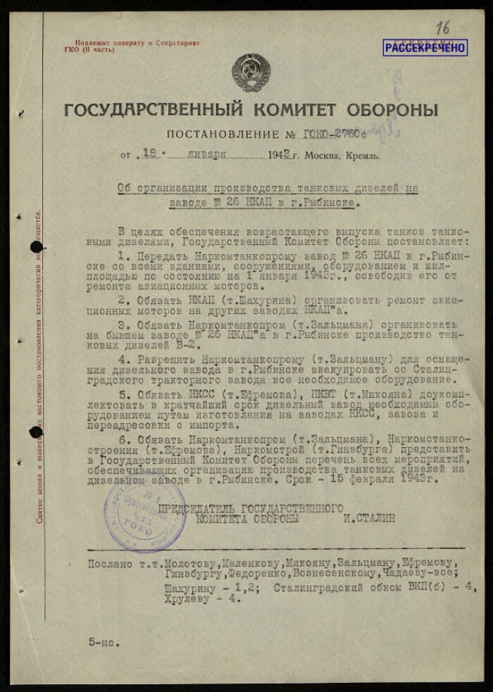 | Заголовок | Постановление ГКО СССР № 2760 с об организации производства танковых дизелей на заводе № 26 Наркомата авиационной промышленности, с приложением докладной записки Зальцмана И. М. Сталину И. В., Молотову В. М. |
