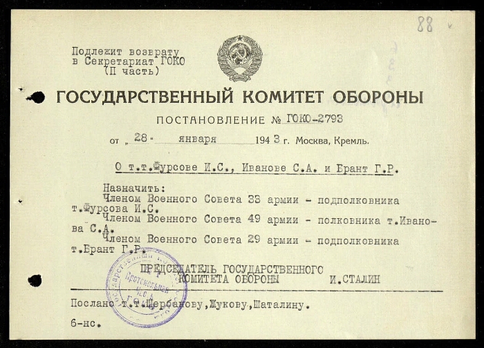 | Заголовок | Постановление ГКО СССР № 2793 о назначении Фурсова И. С. членом Военного совета 33-й армии, Иванова С. А. - членом Военного совета 49-й армии, Бранта Г. Р. - членом Военного совета 29-й армии, с приложением докладной записки Щербакова А. С. Сталину И. В. и справки-объективки |
