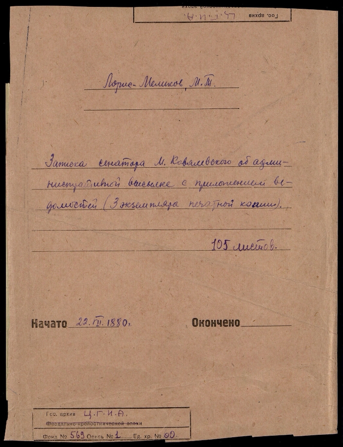 | Заголовок | Записка сенатора М. Ковалевского об административной высылке, с приложением ведомостей (3 экземпляра печатной копии) |
