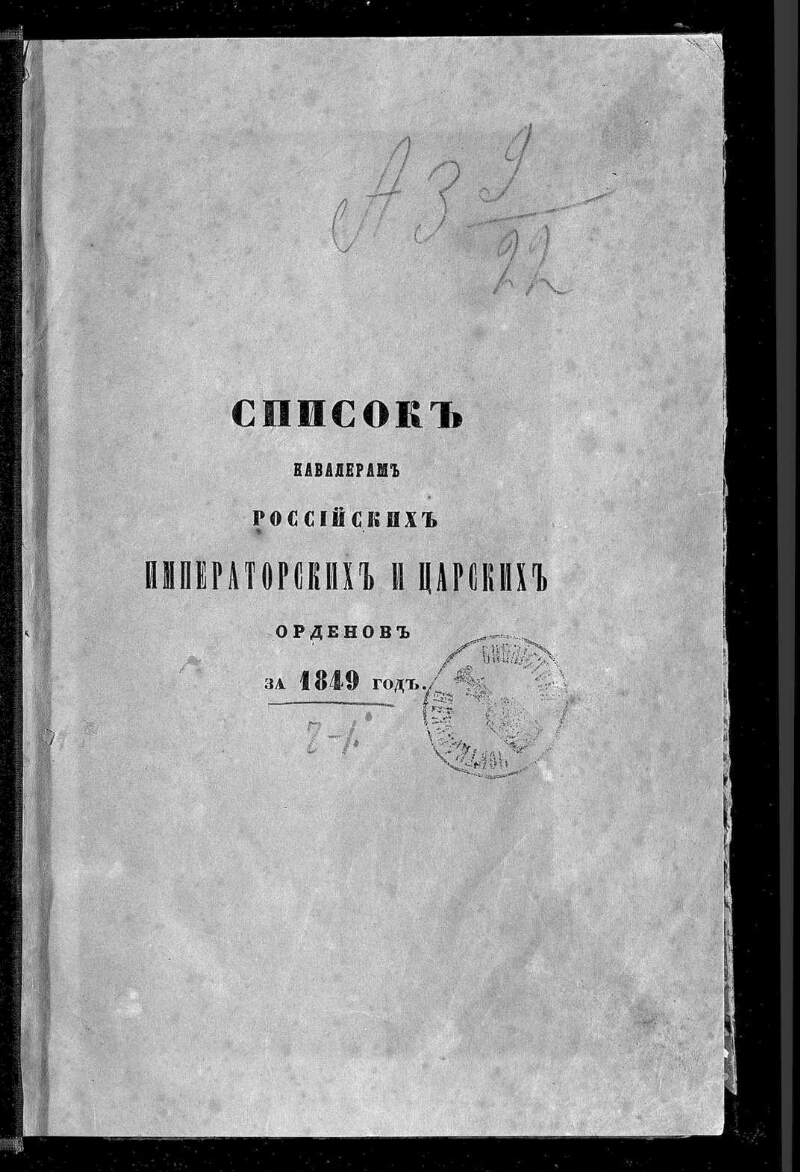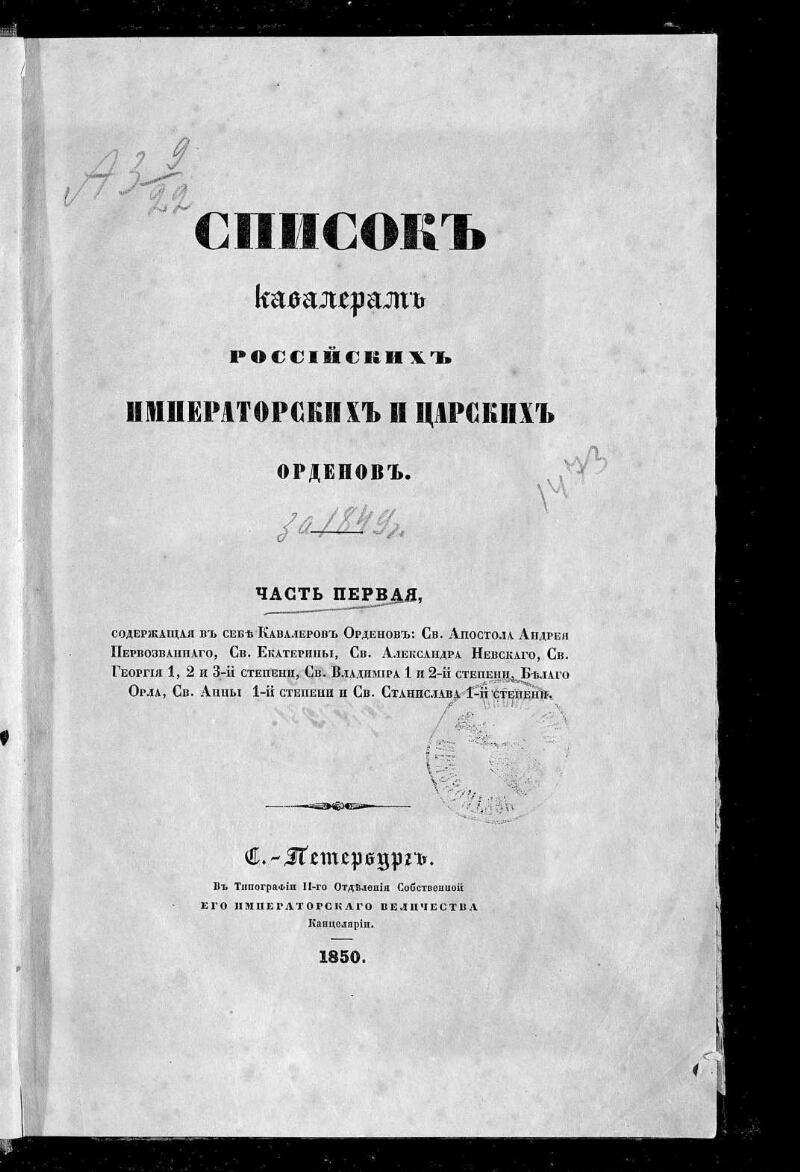 За 1849 г. Ч. 1 : Содержащая в себе Кавалеров Орденов: Св. Апостола Андрея Первозванного, Св. Екатерины, Св. Александра Невского, Св. Георгия 1, 2 и 3-й степени, Св. Владимира 1 и 2-й степени, Белого Орла, Св. Анны 1-й степени и Св. Станислава 1-й степени. - Тип. II-го Отделения Собственной Его Императорского Величества канцелярии, 1850. -[3], 201 с. : табл. ; 17,2 х 25,8 см. - Экз.: без обл., во владельческом переплете, с рукоп. помет.