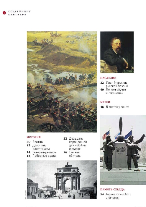 2012, сентябрь. - 2012. -96 с. : цв. фот.. - Из содержания: Братцы / М. Быков (с. 6-11). Дело под Клястицами / М. Быков (с. 12-17). Победные врата / Т. Бирюкова (с. 18-21). Аэромост особого назначения / В. Меньшиков (с. 54-59).