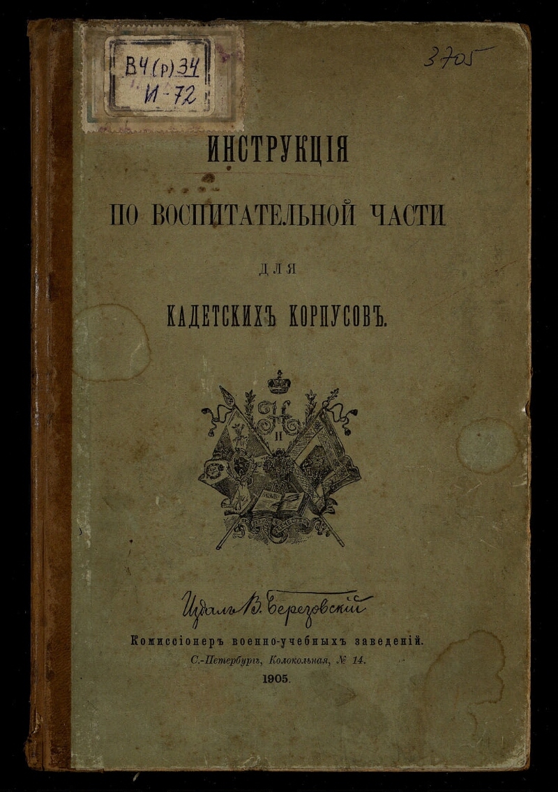 Инструкция по воспитательной части для кадетских корпусов. - Санкт-Петербург : Издал В. Березовский, комиссионер Военно-учебных заведений, 1904 (обл. 1905). -II, 120, [4] с. : табл. ; 16,7 х 24,5 см. - Библиогр. в тексте и подстроч. примеч.. - Экз.: с рукоп. помет.