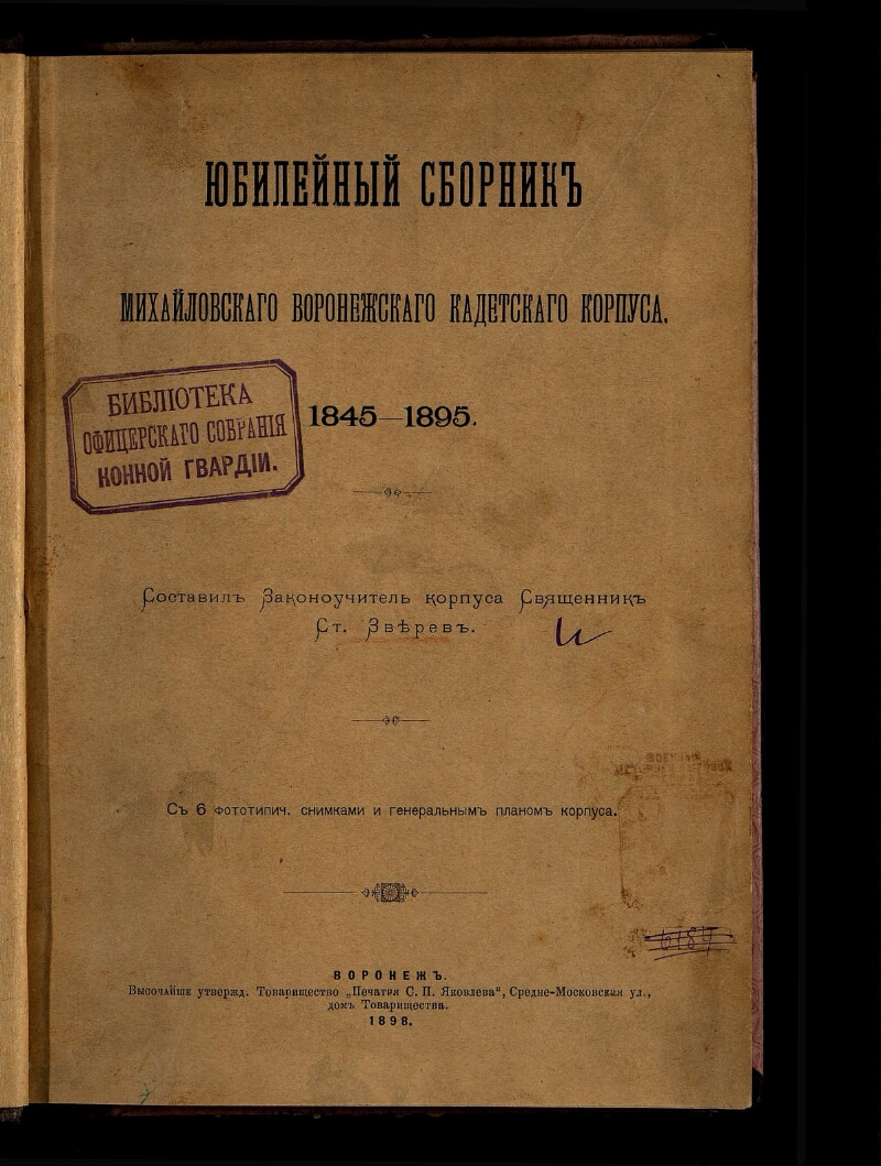Юбилейный сборник Михайловского Воронежского кадетского корпуса. 1845-1895 : С 6 фототипич. снимками и генеральным планом корпуса / Составил законоучитель корпуса священник Ст. Зверев. - Воронеж : Высочайше утв. Товарищество "Печатня С.П. Яковлева", 1898. -XVIII, 339, [2] с., [7] л. ил., пл. : табл. ; 17,8 х 25,2 см. - Библиогр. в тексте и подстроч. примеч.. - Экз.: во владельческом переплете.