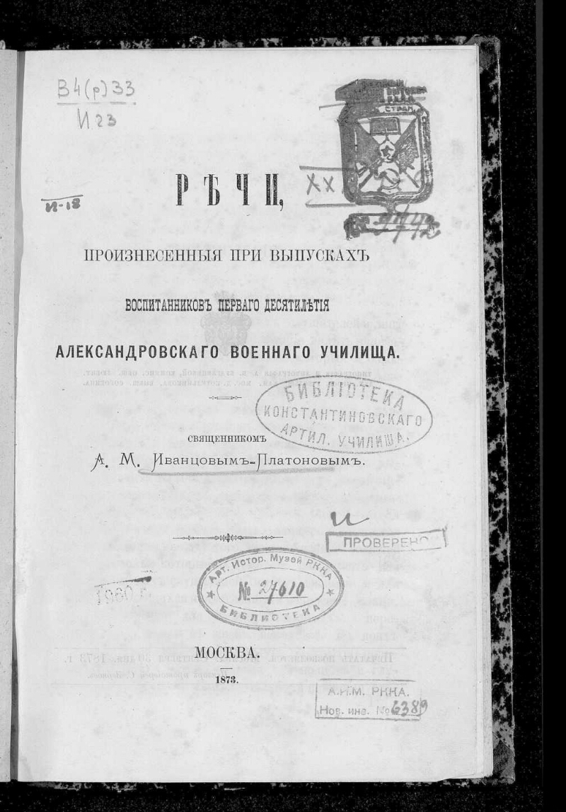 Речи, произнесенные при выпусках воспитанников первого десятилетия Александровского военного училища / [Соч.] священником А.М. Иванцовым-Платоновым. - Москва : Тип. и литогр. А.В. Кудрявцевой, 1873. -205, [1] с. ; 15,3 х 23 см. - Библиогр. в тексте. - Экз.: без обл., во владельческом переплете.
