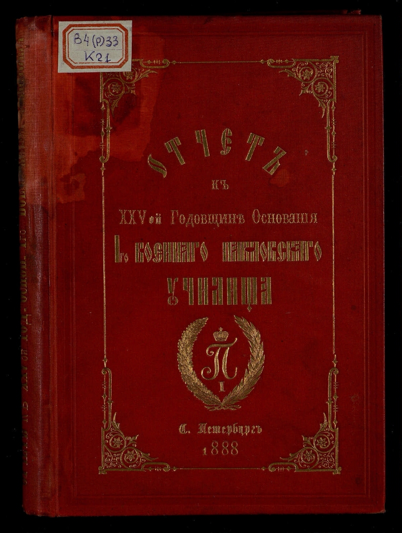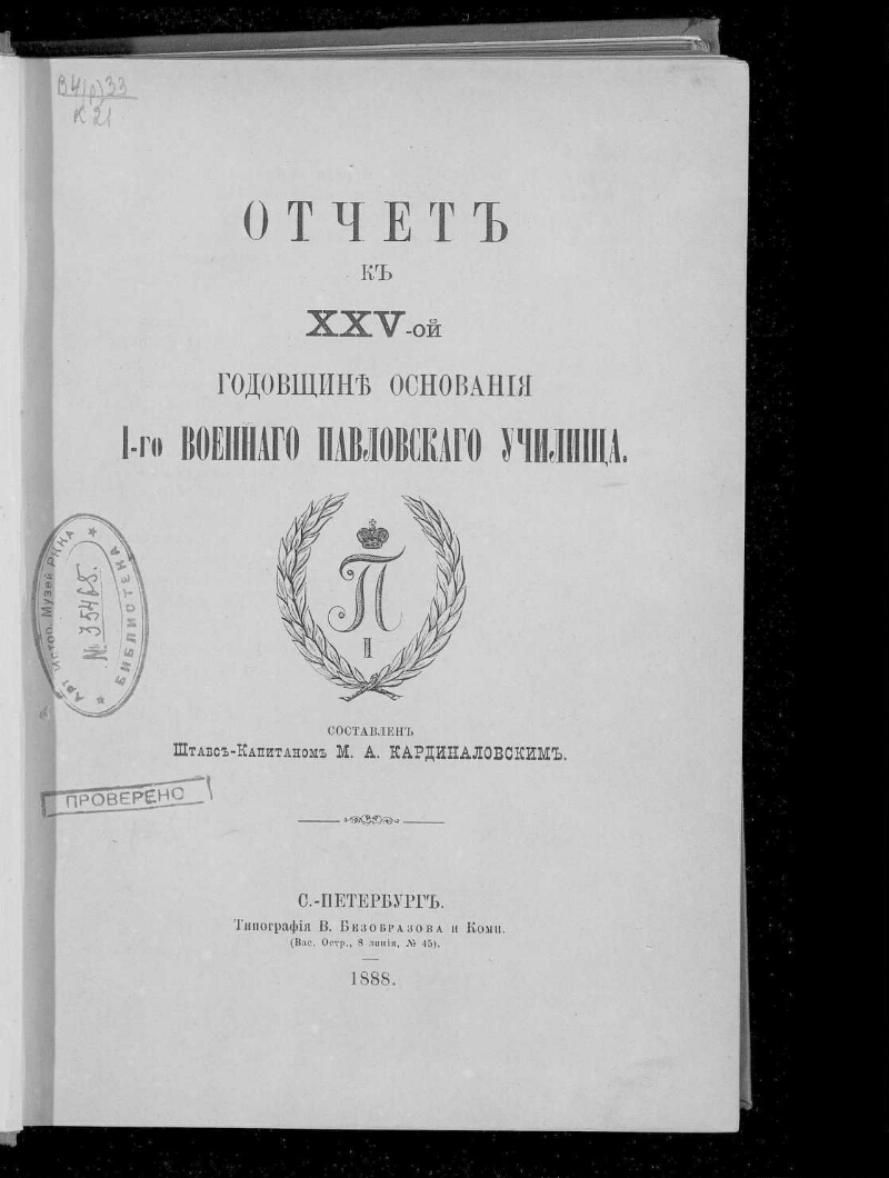 Отчет к XXV-ой годовщине основания 1-го Военного Павловского училища / Составлен штабс-капитаном М.А. Кардиналовским. - Санкт-Петербург : Тип. В. Безобразова и комп., 1888. -252, [5] с. : табл. ; 17,3 х 23,7 см. - Библиогр. в подстроч. примеч.